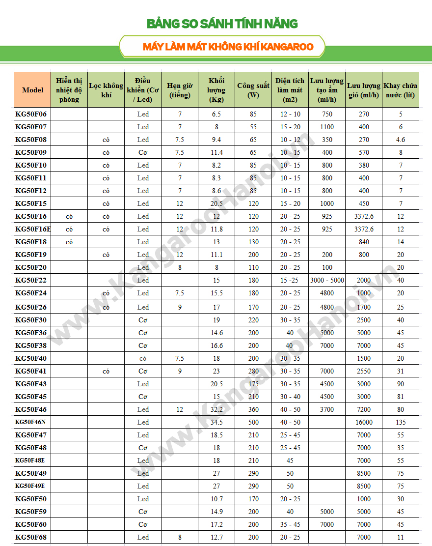 Bảng so sánh các model Máy làm mát không khí Kangaroo 2019