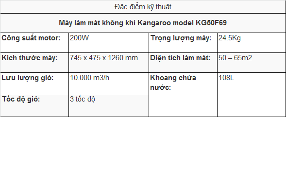 Với công suất 200W và lưu lượng gió lớn, đạt 10.000m3/h, máy làm mát không khí Kangaroo KG50F69 phù hợp với không gian rộng, có diện tích từ 50 – 65m2.